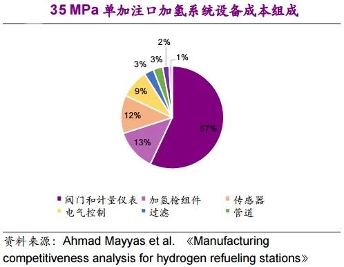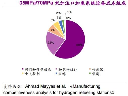 (1)最重要的設備成本是閥門和計量儀表,占設備成本的60%左右。用于監測壓力和氫氣泄漏的傳感器也是加氫系統成本的重要組成部分;