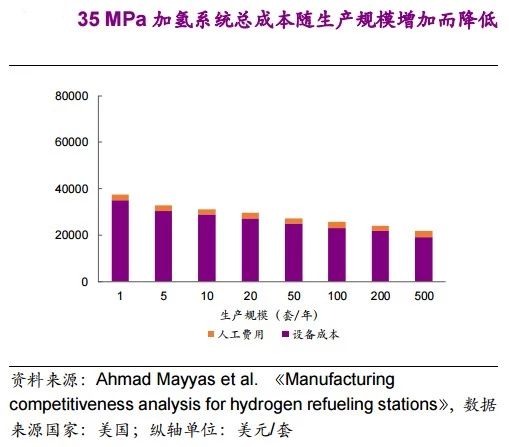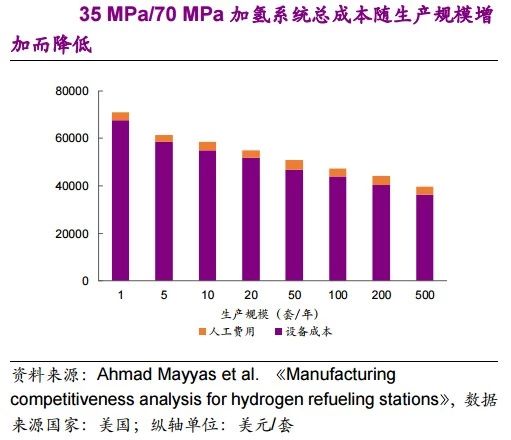 未來,隨著設備生產規模的擴大,規模經濟將產生重大影響。壓縮系統、儲氫系統和加氫系統的成本將顯著降低,外供氫高壓加氫站的總成本將有很大的降低空間。