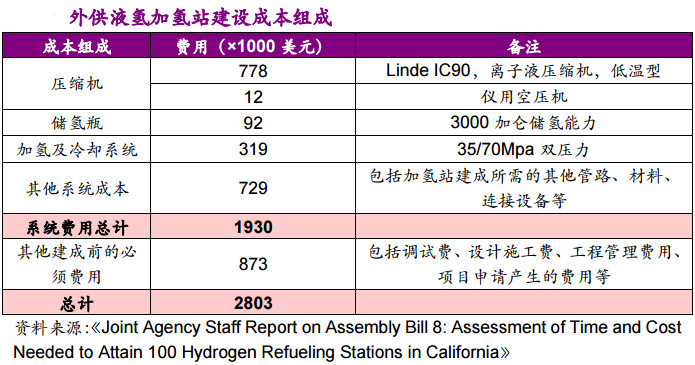 加州能源局研究數據顯示,外供液氫加氫站建成所需的與設備相關的費用約為193萬美元(高于外供氫高壓氫氣加氫站的160萬美元),考慮成本的投入使用之前,需要調試,工程設計成本、管理成本、施工成本等成本,總成本約280萬美元。
