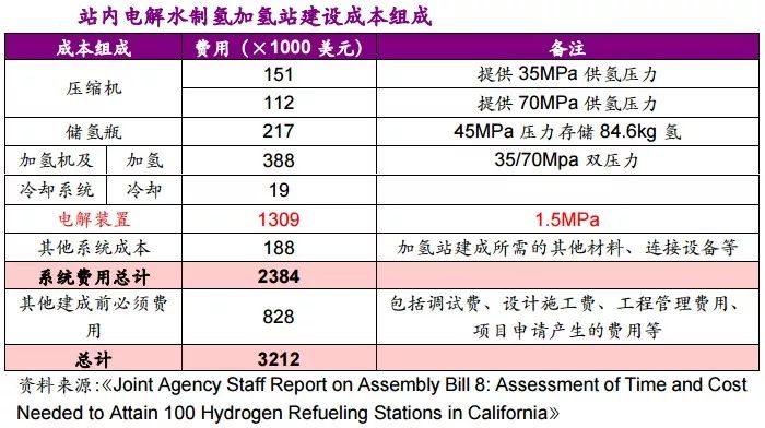 美國加州加氫站采用現場電解水生產氫氣。該加氫站日供氫能力130kg/d,加氫壓力35MPa、70MPa兩種。加氫站的建設成本分析如下。