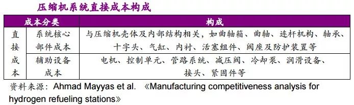 假如加氫站壓縮系統選用活塞式壓縮機,直接成本包含壓縮機外殼及內部結構加工生產制造有關系統核心部件的成本費用,以及電機、控制單元和管道系統相關的輔助設備的成本。