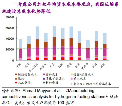 (3)我國加氫站壓縮系統建設成本低的優勢在于勞動力成本和設備/建設成本低。