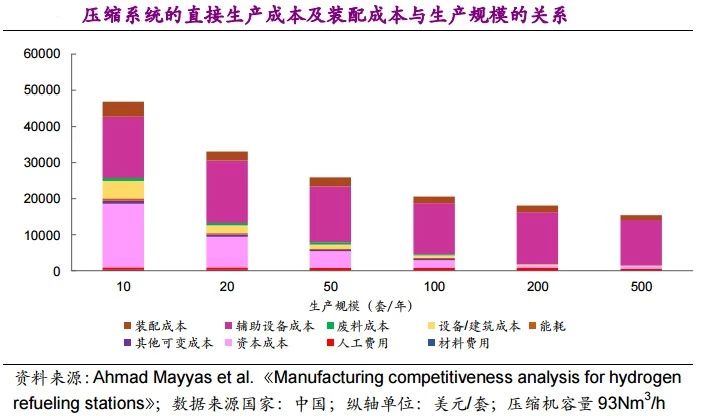 隨著生產規模的增加,輔助設備成本在總成本中所占的比重將超過直接成本。隨著未來需求的增加,用于不同參數的壓縮系統的閥組、接頭、傳感器等輔助部件在制造模式中將趨向于更加標準化和集成化。