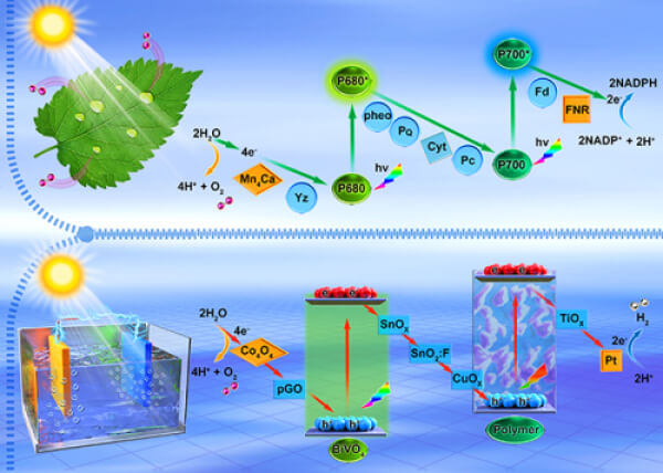 研究中,團(tuán)隊基于自然光合作用的原理,采用多介質(zhì)調(diào)控策略,以自然光合作用Z機(jī)制為靈感,實(shí)現(xiàn)高效光電催化全分解水過程,該團(tuán)隊通過將無機(jī)氧化物基光陽極 (BiVO4) 和有機(jī)聚合物基光電陰極 (PBDB-T:ITIC:PC71BM) 與多種電荷傳輸介質(zhì)耦合,組裝了一種高效的無偏全分離水光電化學(xué)池。研究發(fā)現(xiàn),體系中有機(jī)聚合物的離散能級特性,使得有機(jī)光電陰極和無機(jī)光電陽極的光譜吸收具有很好的互補(bǔ)性,大大提高了太陽能的利用率。此外,該系統(tǒng)在光收集材料和電子受體/供體之間構(gòu)建了包含多種電荷傳輸介質(zhì)的仿生電荷傳輸鏈。在電化學(xué)勢梯度的驅(qū)動下,光生電子通過這些電荷傳輸介質(zhì)有效轉(zhuǎn)移,提高了電荷轉(zhuǎn)移率,降低了電荷復(fù)合率,實(shí)現(xiàn)了高效的電荷分離和轉(zhuǎn)移。結(jié)果,太陽能-氫(STH)轉(zhuǎn)換效率達(dá)到4.3%。該研究通過使用具有匹配能級的多媒體調(diào)控的仿生策略,為高效人工光合系統(tǒng)的合理設(shè)計和組裝提供了新的思路和有效的方法。