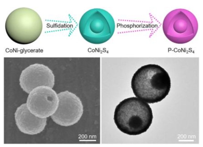 由中國(guó)河南師范大學(xué)(Shuyan Gao)和新加坡南洋理工大學(xué)(Nanyang Technological University, Singapore)的熊文(Xiong Wen (David) Lou)領(lǐng)導(dǎo)的團(tuán)隊(duì)現(xiàn)在開(kāi)發(fā)了一種新型、廉價(jià)、多功能的電極材料,以鈷(Co)和鎳(Ni)為基礎(chǔ),用于高效電催化制氫。采用水熱硫化和氣相磷化相結(jié)合的方法制備鈷鎳甘油酯納米球。這就形成了由磷摻雜鈷鎳硫化物(P-CoNi2S4)制成的蛋黃殼納米顆粒。這些小球體有著緊湊的內(nèi)核和多孔的殼,殼與殼之間有空隙——就像蛋黃被蛋清包圍著,所以不接觸殼一樣。