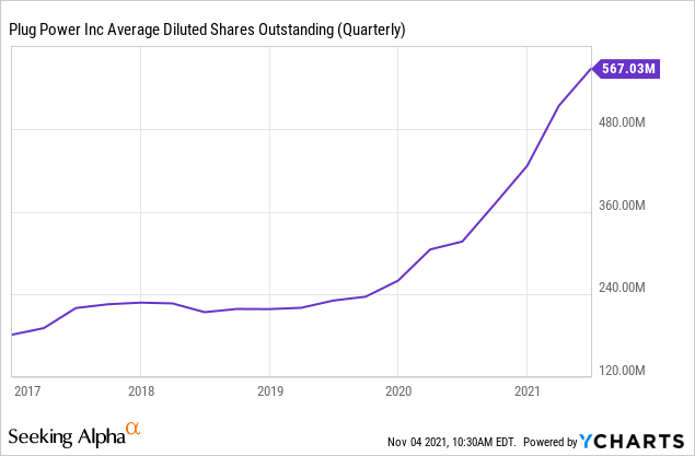 然而,如今,該公司的資產(chǎn)負(fù)債表并不令人擔(dān)憂。該公司擁有約32億美元現(xiàn)金和約50億美元資產(chǎn),僅有約10億美元負(fù)債。因此,總資產(chǎn)負(fù)債率(L/A)僅為20%左右。然而,如下圖所示,Plug Power的巨大資產(chǎn)負(fù)債表的原因是該公司一直在遭受大規(guī)模稀釋。總之,由于大規(guī)模的稀釋,資產(chǎn)負(fù)債表今天非常健康,但由于公司預(yù)計(jì)在未來(lái)幾年不會(huì)盈利,資產(chǎn)負(fù)債表可能會(huì)進(jìn)一步稀釋或惡化。