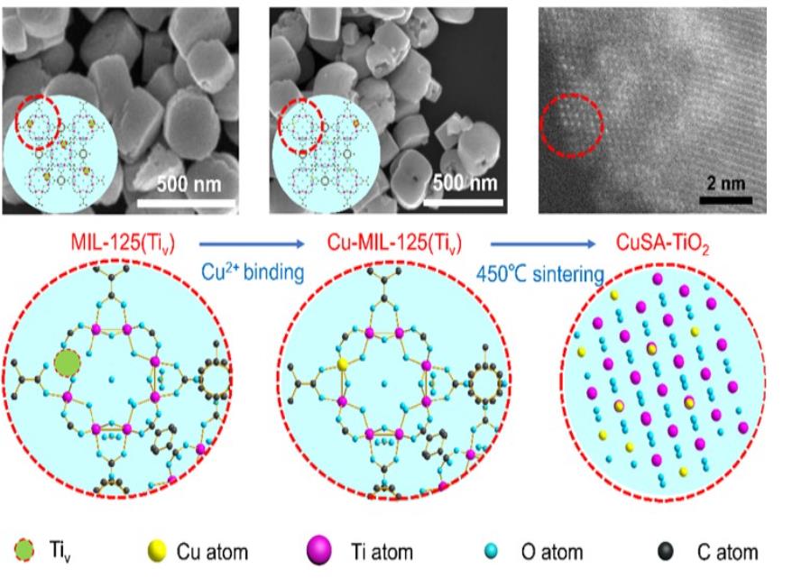 “研究的核心是通過鈦基有機框架材料MIL-125中鈦空位的設(shè)計和可控合成,開發(fā)出比表面積大、鈦空位豐富的二氧化鈦納米材料,錨定過渡金屬銅單原子作為載體,使銅和二氧化鈦形成牢固的‘銅-氧-鈦’鍵。”柳清菊介紹,在光催化制氫反應(yīng)過程中,一價陽離子銅和二價陽離子銅的可逆變化極大地促進了光生電子-空穴的分離和傳輸,大大提高了光生電子的利用率,突破了產(chǎn)氫量子的效率,達到56%。這一突破得到了歐洲科學院院士、倫敦大學光催化與材料化學終身教授唐軍旺團隊的驗證。