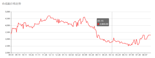 合成氨價格受市場供需影響較大,2017-2021 年,市場均價在 2768-3470 元/t,2022 年上半年市場均價飆升至在 3758-5110 元/t 之間,下半年一度跌落至2746 元/噸,之后有所回升,至2023年8月合成氨價格圍繞2500-3500元/噸區間震蕩。