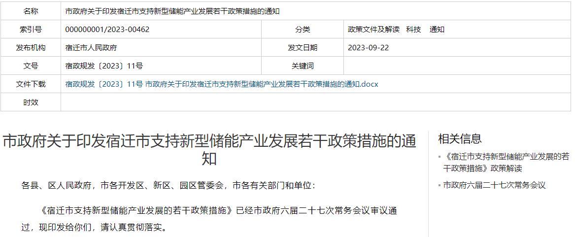 9月22日,為了促進(jìn)宿遷儲能產(chǎn)業(yè)集聚發(fā)展,宿遷市人民政府印發(fā)《宿遷市支持新型儲能產(chǎn)業(yè)發(fā)展的若干政策措施》。