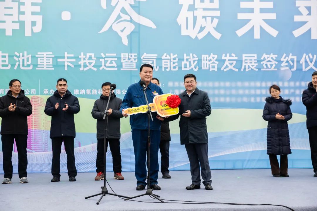 在會場所有領導的見證下,維納氫能執(zhí)行董事宋琦向陜鋼集團龍鋼公司黨委書記、董事長陳驍交付車輛鑰匙,伴隨韓城市委副書記張景鋒的宣布,33輛重卡鳴笛啟動,以氫能重卡為核心的綠色運輸工作正徐徐展開。