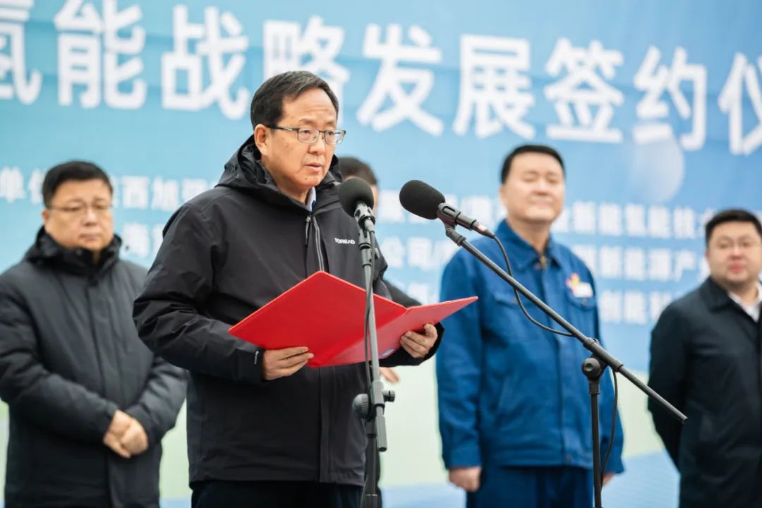 陜西省能源局副局長劉齊,韓城市委副書記張景鋒,韓城市政府黨組成員、副市長郭繼鋒,陜西省工業(yè)和信息化廳原材料工業(yè)處副處長謝韜,陜鋼集團副總經(jīng)理韋武強、龍鋼公司黨委書記、董事長陳驍、維納氫能執(zhí)行董事宋琦、旭強瑞公司總經(jīng)理王進輝等氫能企業(yè)代表共同出席。