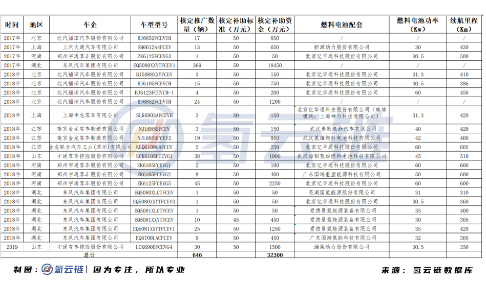 總計646輛,補貼3.23億元!工信部公示2016-2019年FCEV最終補貼名單