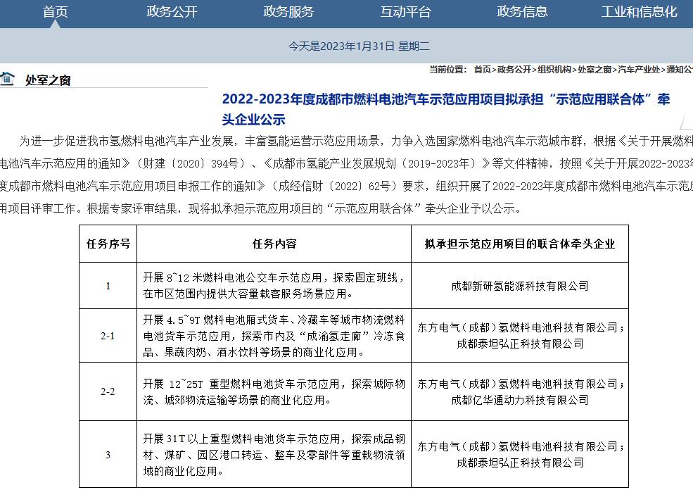近日,成都市經濟和信息化局發布了《2022-2023年度成都市燃料電池汽車示范應用項目擬承擔“示范應用聯合體”牽頭企業公示》。在發布的4個項目中,東方氫能承擔了3個示范應用項目,成為示范應用場景最多的牽頭企業。