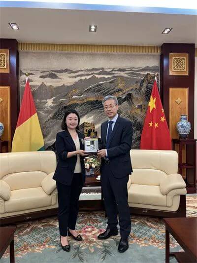 考察團(tuán)首站是西部非洲幾內(nèi)亞,抵達(dá)首都科納克里當(dāng)日,拜會(huì)了中華人民共和國(guó)駐幾內(nèi)亞大使館。黃巍大使和蔡亮公參一行接見了考察團(tuán)全體成員,江四元董事長(zhǎng)介紹了上海市湖北商會(huì)的大體情況、考察團(tuán)成員和企業(yè)狀況。黃巍大使對(duì)考察團(tuán)赴幾內(nèi)亞投資考察表示熱烈歡迎,并就中幾關(guān)系、幾內(nèi)亞投資環(huán)境、人文做了介紹,希望企業(yè)家們?cè)趲變?nèi)亞能夠找到自己感興趣的投資方向。蒲紅霞董事長(zhǎng)就羚牛氫能已開展和未來計(jì)劃開展的工作與大使和公參進(jìn)行交流。