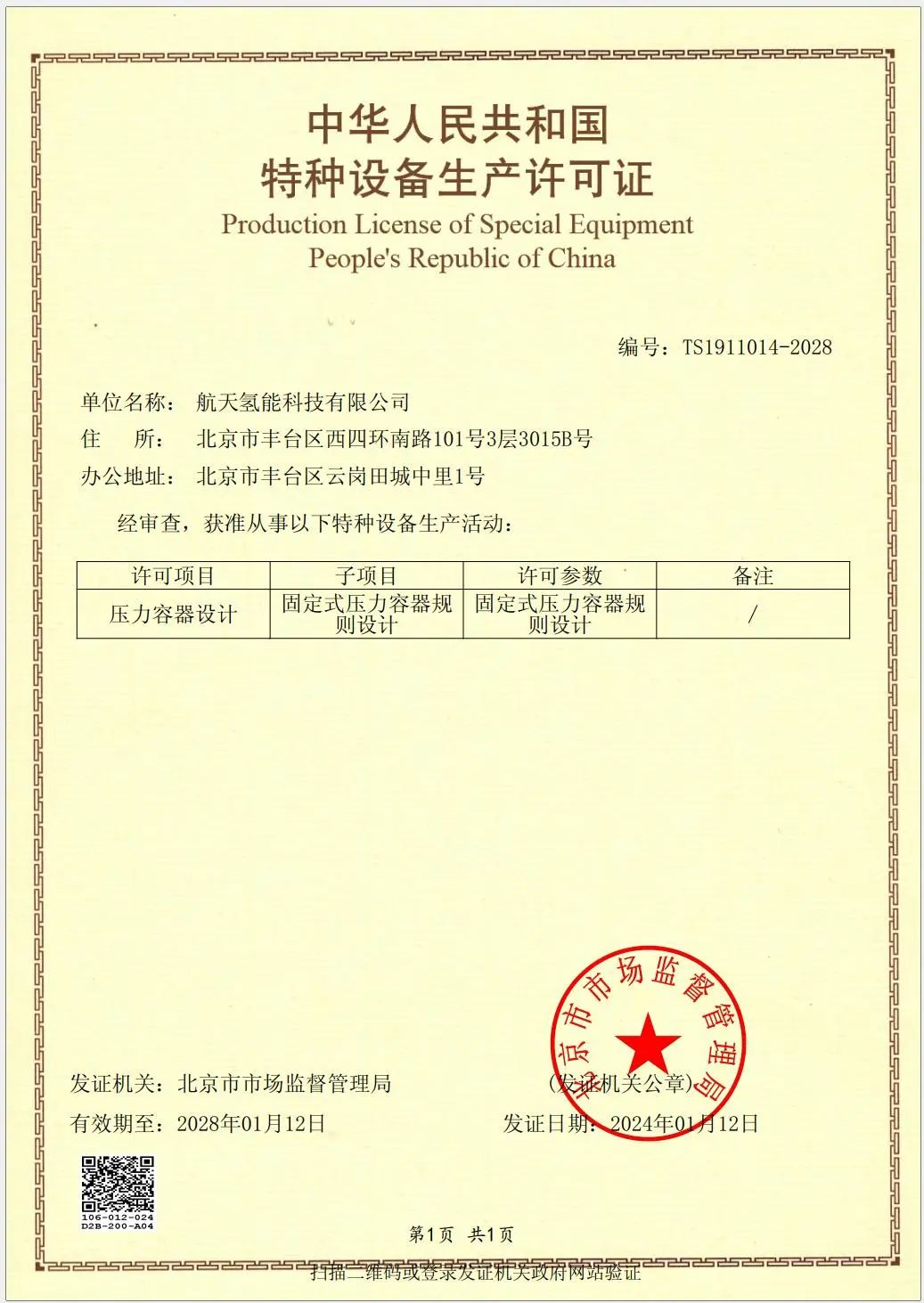 在2024年開年之際,航天氫能科技有限公司喜迎佳音,經(jīng)過各部門共同地努力,公司順利通過了中國(guó)化工裝備協(xié)會(huì)專家評(píng)審組的評(píng)審,取得了壓力容器設(shè)計(jì)-固定式壓力容器規(guī)則設(shè)計(jì)許可證。(編號(hào):TS1911014-2028)