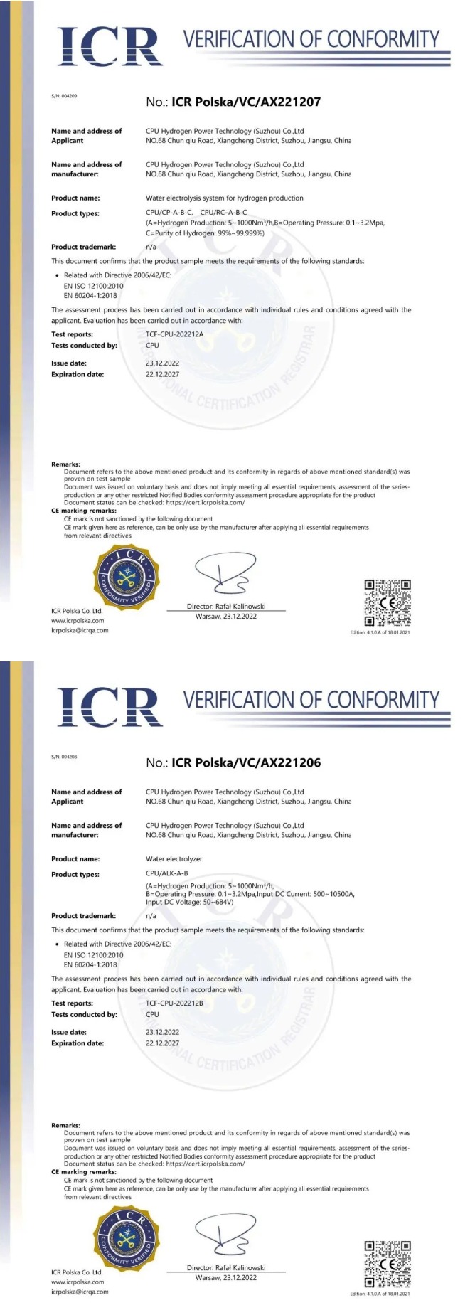 歐盟CE認(rèn)證的獲得標(biāo)志著希倍優(yōu)堿性水電解制氫系統(tǒng)的整體安全性能符合歐盟規(guī)范、安全技術(shù)能力達(dá)到全球行業(yè)先進(jìn)水平,可在歐盟國(guó)家及其他認(rèn)可歐盟CE認(rèn)證國(guó)家進(jìn)行銷售。