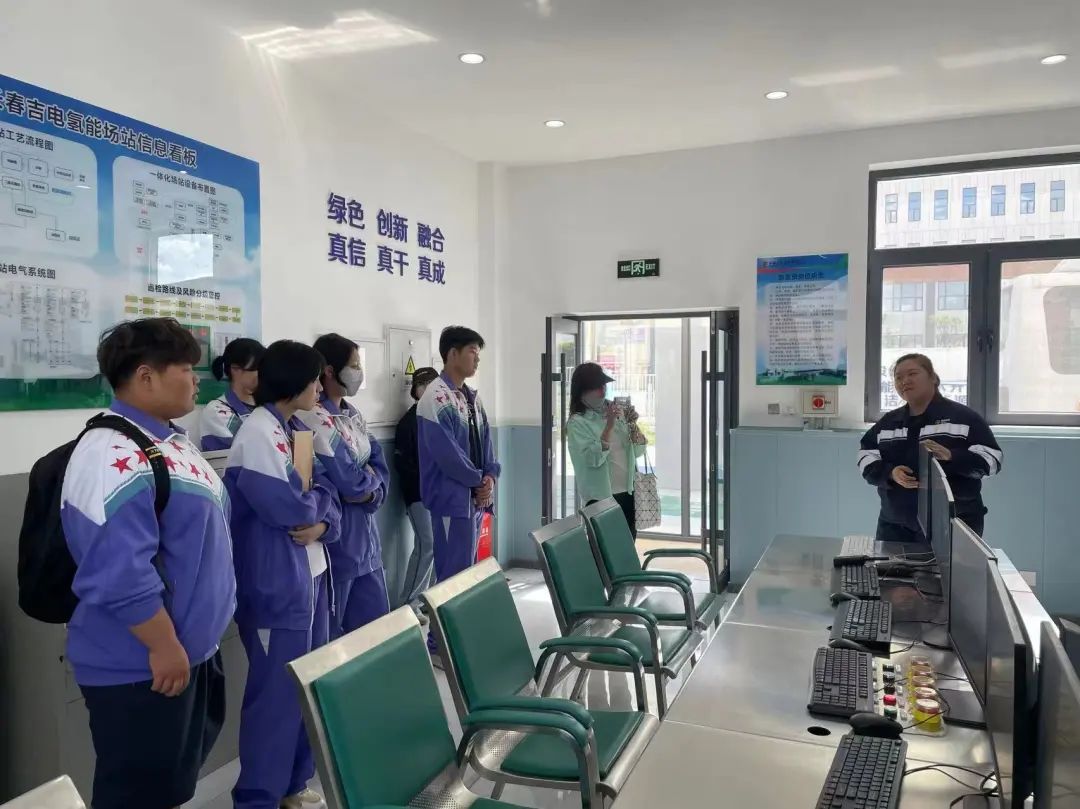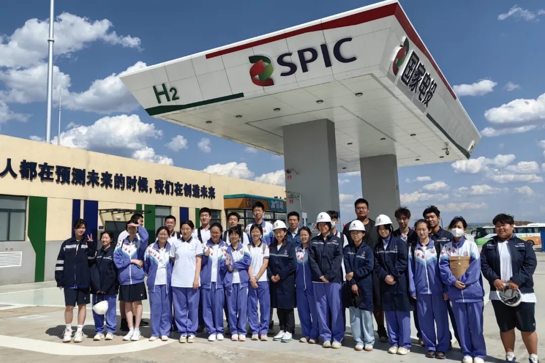 參觀過程中,同學們嚴格遵守現(xiàn)場安全規(guī)程,時刻保持現(xiàn)場秩序。該公司結(jié)合目前氫能產(chǎn)業(yè)現(xiàn)狀,詳細介紹了公司在吉林省內(nèi)的氫能產(chǎn)業(yè)布局,以及對國內(nèi)、外市場氫基綠色能源的長期戰(zhàn)略規(guī)劃。隨后,現(xiàn)場技術(shù)人員對國家電投自主研發(fā)制造的PEM制氫設(shè)備以及創(chuàng)新打造的前站后廠式“可再生能源+PEM制氫+加氫”一體化運作模式進行詳細講解,充分展示了公司推動氫能產(chǎn)業(yè)發(fā)展取得的顯著成效。值得一提的是,本次參觀同學們?nèi)坛俗鴼淠艽蟀屯凳袇^(qū),切身實地感受氫能的“魅力”。
