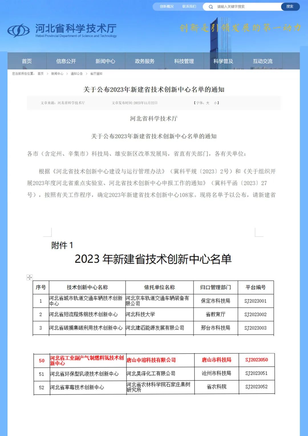 [ 導讀 ]2023年11月22日,河北省科學技術廳在其官網公布了2023年新建省技術創新中心名單,唐山中溶科技有限公司的“河北省工業副產氣制燃...