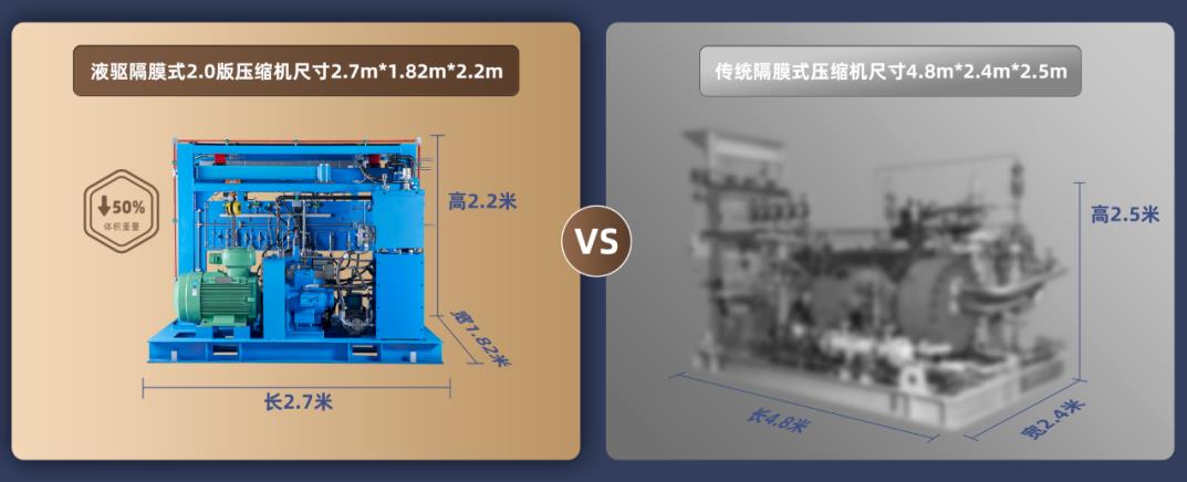 模塊化設計,尺寸極其緊湊,占地面積、整機體積、重量均僅為傳統隔膜式壓縮機的50%左右,非常有利于加氫站、制加氫一體站、綜合能源站的靈活布局,且不需要額外做地基建設,節約建設成本。