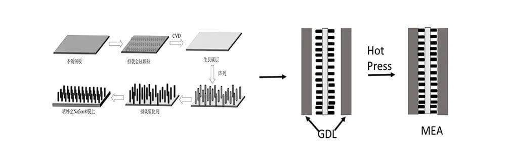 第一代稱為氣體擴(kuò)散型膜電極(Gas Diffusion Electrode,GDE),通常采用絲網(wǎng)印刷方法,將催化層制備到擴(kuò)散層上(圖1)。第二代為催化劑涂覆膜(Catalyst Coated Membrane,CCM)制備法,即把催化層制備到膜上,是目前主流的膜電極制備技術(shù)。與第一代方法相比,該方法使用質(zhì)子交換膜的核心材料作為黏結(jié)劑,降低了催化層與PEM之間的質(zhì)子傳輸阻力,在一定程度上提高了膜電極的性能以及催化劑的利用率和耐久性。第三代膜電極為有序化膜電極(圖3)。目前,第三代膜電極的量產(chǎn)技術(shù)主要被以美國(guó)3M公司為代表的國(guó)際材料巨頭掌握(這里不做重點(diǎn)介紹)。