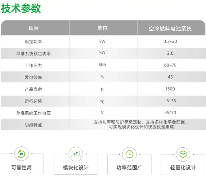 國氫科技開發的空冷燃料電池系統,提供多樣化的平臺動力系統解決方案,系統采用模塊化設計,結構緊湊,可根據不同應用場景進行功率、防護等級的定制設計,功率涵蓋0.3kW~20kW,適用于無人機、小型車輛、備用電源等場景。