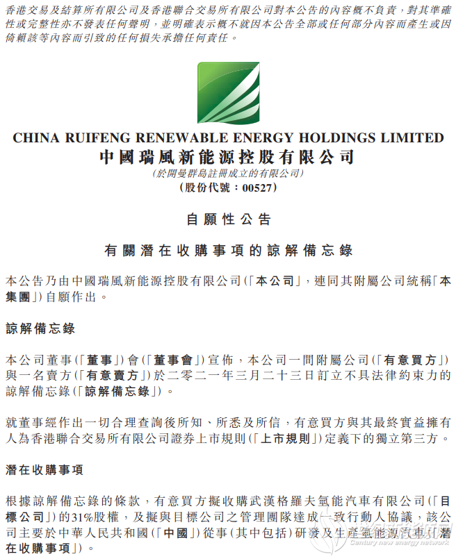 氫能觀察消息:3月23日,瑞風新能源發布公告稱,其附屬公司與一名獨立第三方賣方簽訂不具法律約束力的諒解備忘錄,擬收購武漢格羅夫氫能汽車31%股權,及擬與該汽車公司管理團隊達成一致行動人協議。根據公告,雙方將于4月30日進行進一步磋商。